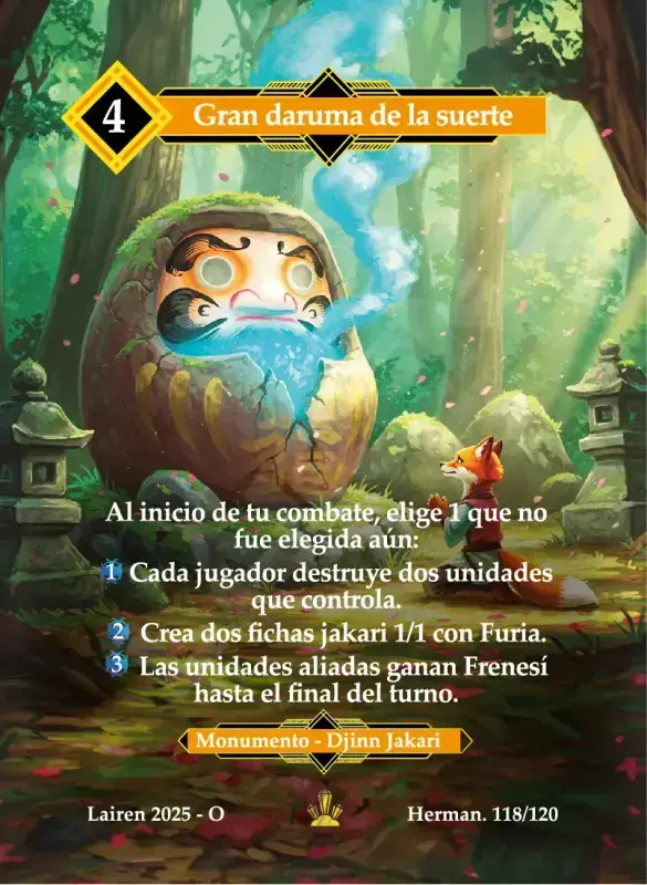 Texto de carta: Al inicio de tu combate, elige 1 que no fue elegida aún: -Cada jugador destruye dos unidades que controla. -Crea dos fichas jakari 1/1 con Furia. -Las unidades aliadas ganan Frenesí hasta el final del turno.